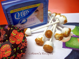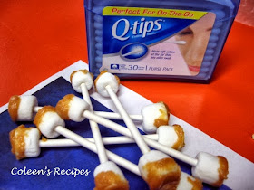 All you need is some white lollipop sticks, some miniature marshmallows and some peanut butter chips; it is quick and easy!!